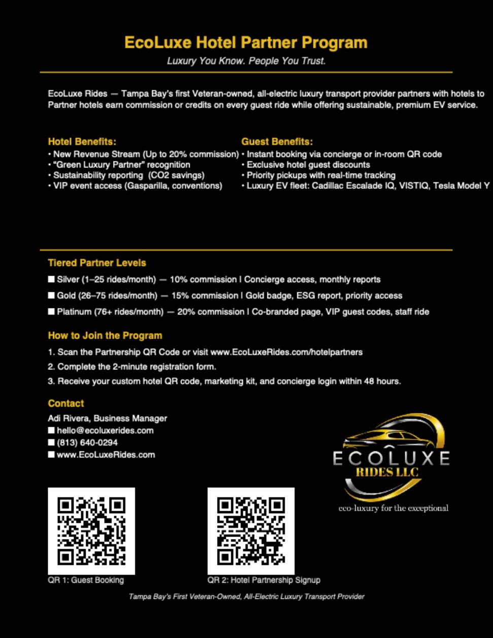 EcoLuxe Rides partners with Tampa Bay’s premier hotels to deliver five-star guest transport from airport pickups to private events. Enhance guest satisfaction, strengthen brand loyalty, and earn referral revenue all while offering eco-friendly luxury.